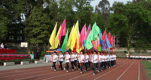 上午8:00,运动会在师生的期待中开始,首先是国旗队、校旗队、鲜花队和彩旗队入场。随后,各学院运动员代表队在整齐的步伐中开始了。各方阵统一着装,迈着矫健的步伐依次走过主席台。其中头戴安全帽阵营的方阵令人眼前一亮,他们是来自于城乡建设学院的运动员代表队;旅游学院手持彩花的啦啦操队员们在主席台前跳起了舞蹈,给师生呈现一个惊艳的亮相;商学院运动员们手持小红旗,在主席台前放飞彩色气球,展示着学院挥动激情、放飞梦想、齐心协力、健康积极的精神风貌。