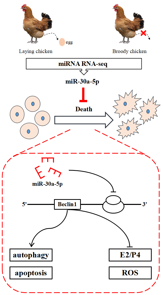 就巢性是禽类的一种母性行为,是家禽自然繁殖后代的一种本能,具体表现为排卵退化和排卵终止,其实质就是卵泡闭锁。我校动物科技学院尹华东教授团队以自主培育的国家级优质鸡配套系“天府肉鸡”为模型,挖掘筛选调控鸡卵泡发育的重要候选因子。通过对正常生长发育的鸡卵泡和闭锁卵泡miRNA转录组测序发现miR-30a-5p表达量存在明显差异,推测其可能影响卵泡发育。随后,在体外培养的鸡原代卵泡颗粒细胞中发现miR-30a-5p靶向抑制细胞自噬标志因子Beclin1基因的表达;干扰和过表达miR-30a-5p后,通过qPCR、Western Blot、流式细胞术、ELISA等技术检测发现miR-30a-5p可明显影响颗粒细胞凋亡、自噬以及雌二醇和孕酮激素合成;通过共聚焦显微镜和透射电子显微镜观察发现miR-30a-5p还可影响自噬溶酶体产生。综上结果表明,miR-30a-5p通过干扰Beclin1基因表达抑制鸡卵泡颗粒细胞的自噬和凋亡,并促进类固醇激素的产生,从而缓解卵泡萎缩。本研究结果为系统全面的解析小RNA调控鸡卵泡发育的分子机理提供基础,为进一步提高我国地方鸡的繁殖性能提供理论依据。