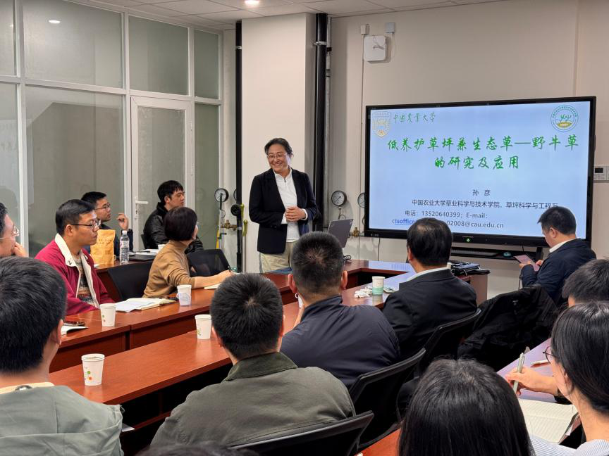 报告会上,三位专家分别围绕各自的研究领域,分享了草业科学的前沿成果。产祝龙教授以《多年生黑麦草应答温度胁迫机理》为题,从分子层面深入剖析了禾草应对逆境的复杂生物学机制,为草类植物抗性育种提供了重要的理论依据。孙彦教授的报告《低养护草坪兼生态草—野牛草的研究及应用》,则聚焦于可持续发展的生态理念,系统介绍了野牛草在低养护草坪建设中的巨大潜力和应用前景,为美丽中国建设提供了绿色方案。胡涛教授以《牧草基因编辑种质创新研究》为主题,展示了前沿的基因编辑技术在牧草种质创新和产量提升中的革命性应用。