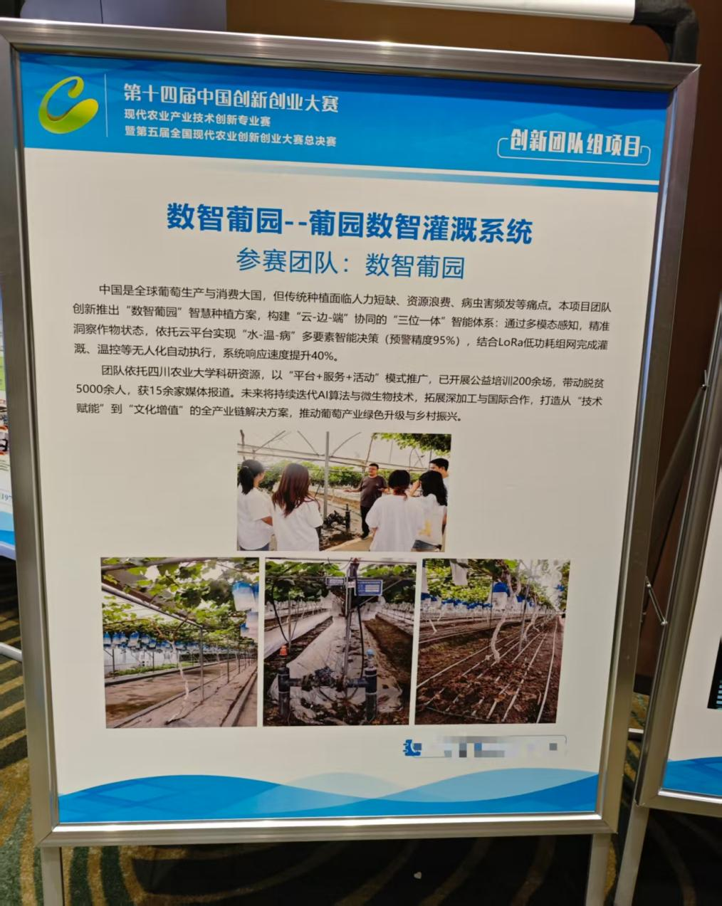 近日,第十四届中国创新创业大赛现代农业产业技术创新专业赛暨第五届全国现代农业创新创业大赛总决赛在陕西省杨凌农业高新技术产业示范区圆满落幕。园艺学院“数智葡园—葡园数智灌溉系统”创新团队从全国31个省(自治区、直辖市)及澳门、台湾地区的50个优质晋级项目中脱颖而出,最终斩获创新团队组别二等奖。