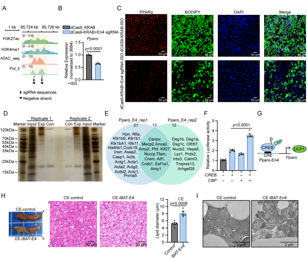 本研究发现一个在长期寒冷适应条件下调控棕色脂肪产热的转录因子PPARα,发现短时间冷刺激不激活PPARα调控BAT产热,但是长期寒冷条件下PPARα被激活促进非颤栗性产热进而调节体温。通过环状染色质构象捕获技术系统绘制了棕色脂肪(BAT)和白色脂肪(WAT)中Pparα基因的染色质互作图谱,揭示了两种脂肪之间显著不同的Pparα相关染色质互作模式,进一步鉴定出一个寒冷条件下棕色脂肪特异性活性增强子Pparα-En4,通过CRISPR干扰系统靶向抑制Pparα-En4区域的活性导致棕色脂肪细胞的分化及产热功能受损。机制研究表明,转录因子CREB与乙酰转移酶CBP协同调控Pparα-En4活性,促进Pparα转录激活,通过解偶联作用将体内ATP的能量快速转化为热量,使机体能够迅速调节体温,进而以非颤栗性产热的方式来应对寒冷环境带来的挑战。动物实验进一步验证,Pparα-En4抑制导致小鼠在长期寒冷适应条件下BAT的产热能力下降、线粒体功能受损;而在37℃热中性条件下,该增强子不参与产热调控,而主要影响棕色脂肪的脂质代谢过程。