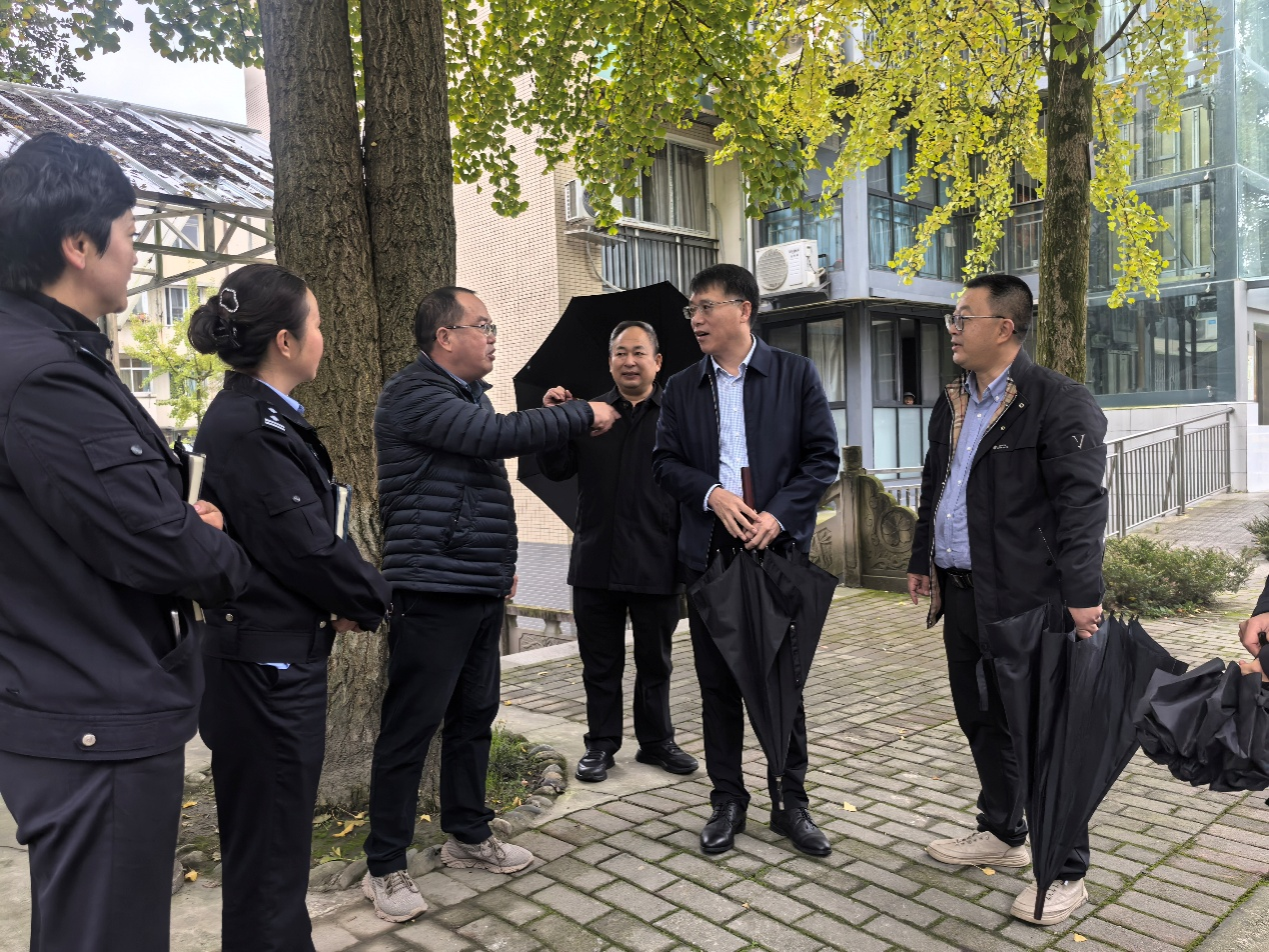 在综管办相关负责人陪同下,廖苹一行实地察看了校区南、北门等重点区域的人员车辆管理与安防设施运行情况,并检查监控中心技防系统的建设与使用状况。