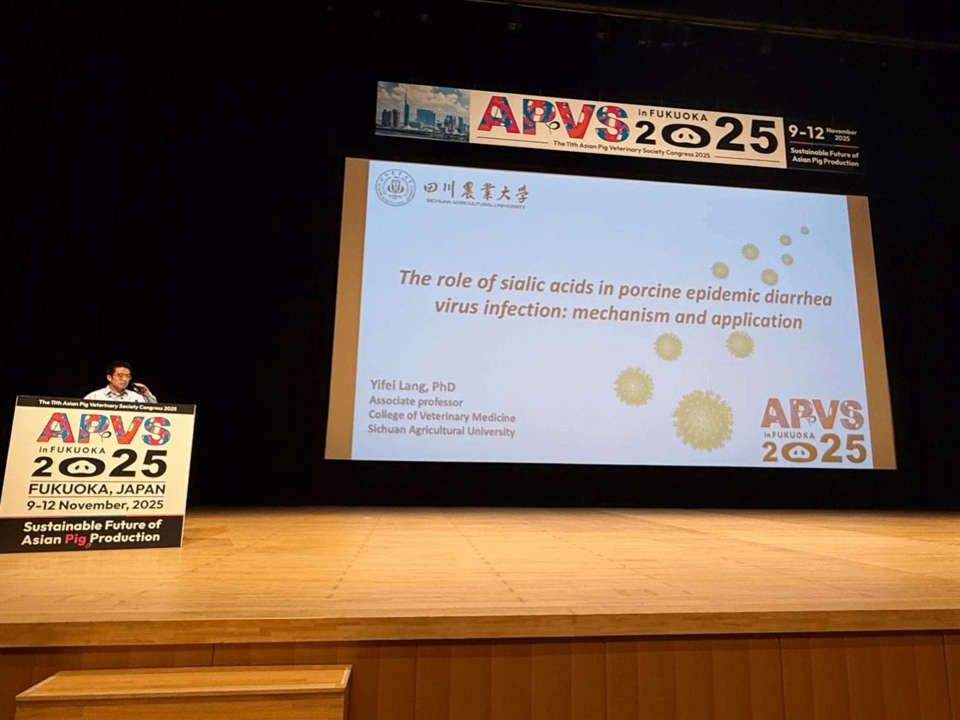 日前,第11届亚洲猪病会(The 11th Asian Pig Veterinary Society Congress 2025,也译作亚洲猪兽医大会)在日本福冈召开。我校动物医学院郎一飞副教授应邀参会,并作题为“The role of sialic acids in porcine epidemic diarrhea virus infection: mechanism and application”(唾液酸与猪流行性腹泻病毒感染:机制与应用)的大会专题报告。