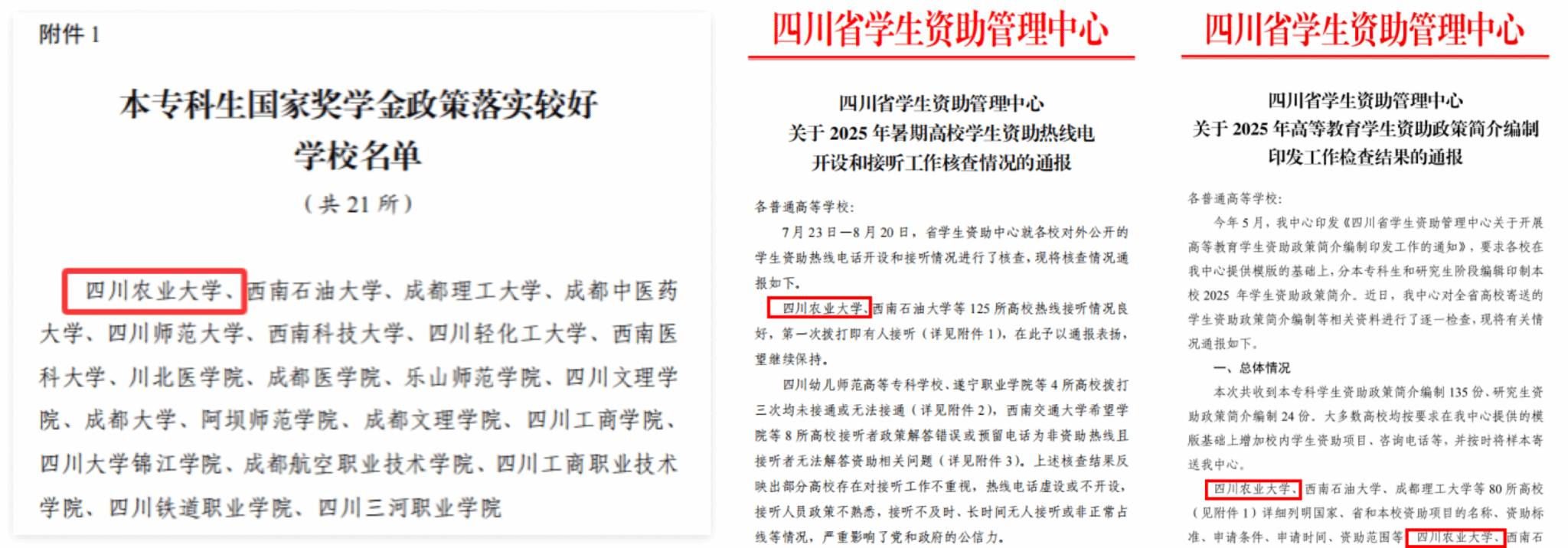 此外,学校在多项基础性资助工作中也获得肯定,包括四川省教育厅、省学生资助管理中心对2024-2025学年高校国家奖助学金政策落实情况、暑期资助热线电话工作、资助政策简介编制印发工作、资助业务知识测评题库征集工作等的通报表扬。
