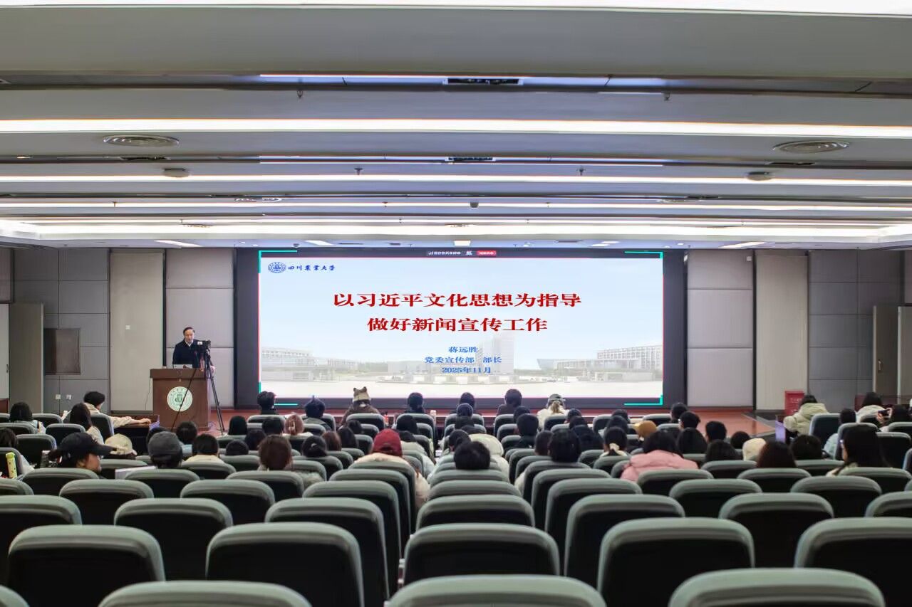 校党委常委、宣传部部长蒋远胜讲授《以习近平文化思想为指导做好新闻宣传工作》,深入解读习近平文化思想核心要义及对高校宣传工作的指导意义,指出新媒体工作者要坚守正确政治方向与舆论导向,凸显新闻宣传的价值引领作用。