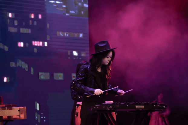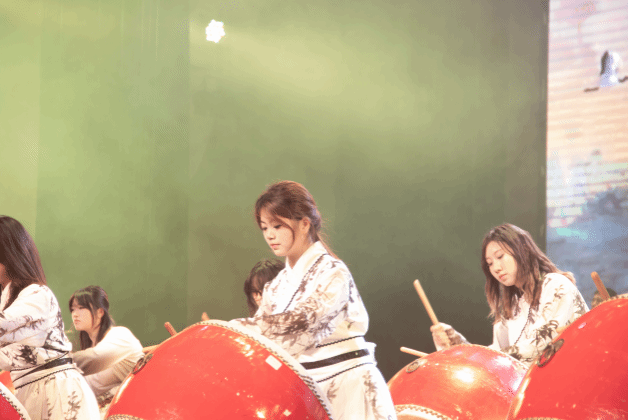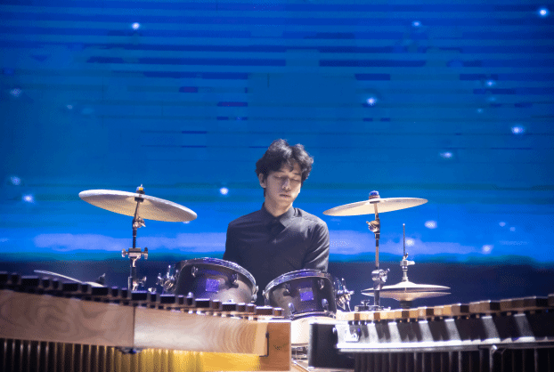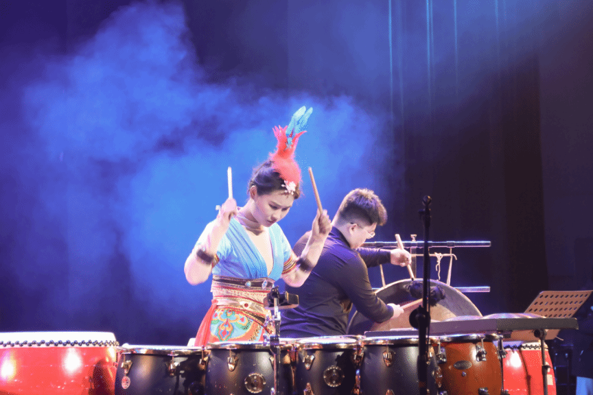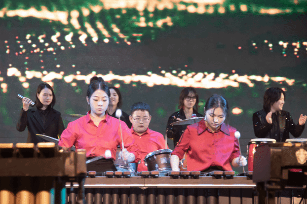 当晚,音乐会气氛热烈,我校原创曲目《炎黄》大气开场,以磅礴旋律展现文化传承,紧接着,十首风格多元的曲目轮番上场。《碟中谍》加入情景演绎与互动,配合紧凑鼓点诠释攻坚勇气;《青峦鼓鸣》融合敦煌意象与民族鼓韵,抒发川农人的家国情怀。四川音乐学院打击乐团演绎的《Team work》展现协同共创的合作精神;《Losa》以西非传统节奏体现无限的音乐可能;《魔笛》彰显守正创新的艺术追求。西南交通大学打击乐团带来的《毕方》以灵动节奏展现创新活力;《山响》诉说扎根地方的深厚情怀;《Catching Shadows》传递探索姿态。我校打击乐团带来的《科技先锋》成为全场亮点。该作品在我校刚刚结束的第十届“银杏之声”器乐大赛中荣获“一等奖”,来自巴基斯坦的留学生Kinza Bashir与乐团成员默契配合,她表示:“在练习和演奏《科技先锋》时,我特别喜欢那种‘琴’‘鼓’‘镲’等多种打击乐碰撞交织出的新鲜听感。和大家一起反复磨合节奏、调整配合的过程也让我真切感受到了音乐跨越语言的凝聚力。”