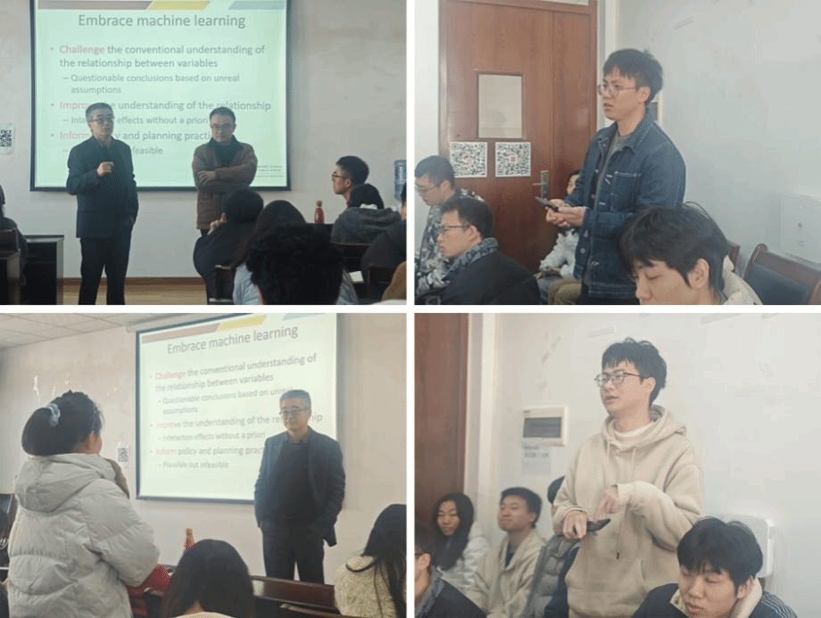 曹新宇教授以“利用机器学习实现规划政策研究创新”为主题,分享了其发表在Artificial Intelligence for Transportation期刊上的论文。通过对文章进行重新思考,曹教授带领参会同学深入剖析了数据分析的思维模式、机器学习在科研的切实应用与论文撰写方法,并引导同学们明确研究的目的——能为现实问题提出切实的优化方案。同时,曹新宇教授结合自身经历与经验,以国际视野解释、补充学术过程,氛围在严肃与轻松中切换。交流环节中,我院师生结合自身在研课题积极提问、踊跃发言,获得了曹教授的积极回应与肯定。