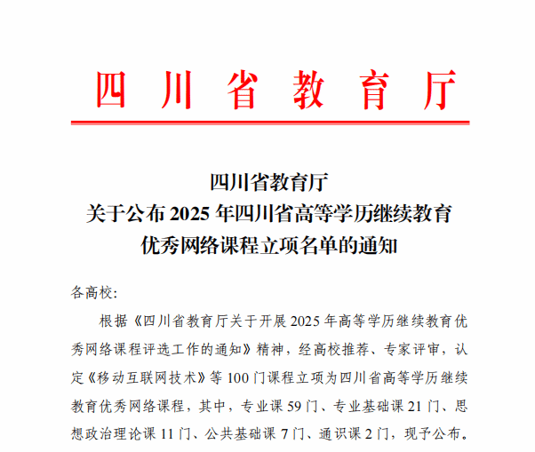 近日,四川省教育厅正式公布了2025年四川省高等学历继续教育优秀网络课程立项名单。在全省严格评审并最终立项的100门优秀课程中,我校9门课程成功入选,涵盖农、工、理等多个学科门类,入选总数位居全省高校前列,体现了我校在高等学历继续教育领域深化教学改革、推动数字化转型的卓越成效与领先地位。