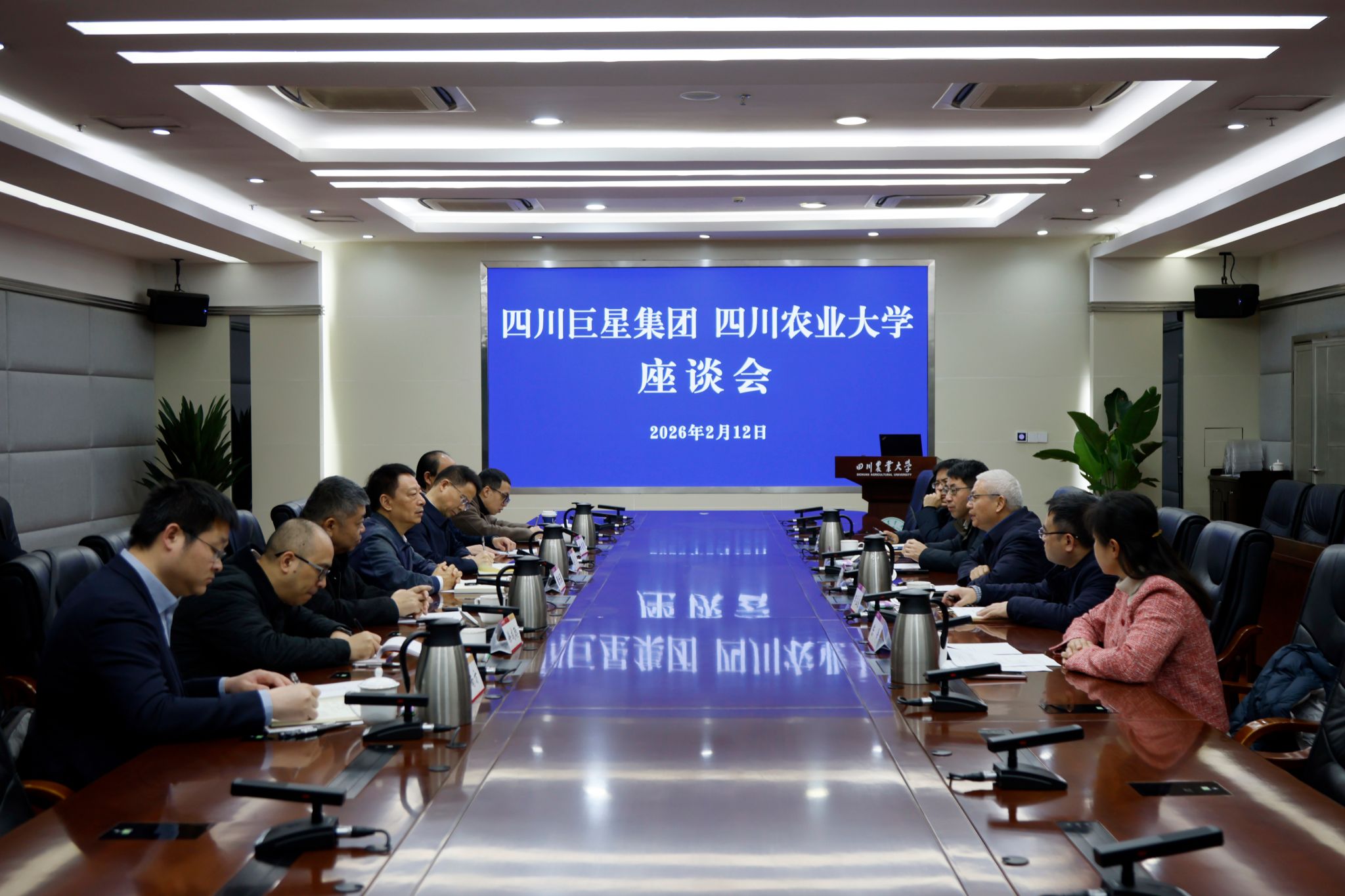 2月12日上午,在农历马年新春佳节即将到来之际,四川巨星企业集团董事长唐光玥一行莅临四川农业大学,就深化校企合作、推进产教融合等事宜进行深入交流座谈。乐山巨星农牧股份有限公司董事长岳良泉,乐山巨星农牧股份有限公司副董事长、巨星研究院院长苏宁,乐山巨星农牧股份有限公司副总经理、人力资源部部长唐旋,巨星研究院副院长曾南方等陪同调研并参加座谈。校长吴德,科技管理处,动物科技学院,动物医学院等相关职能部门负责人出席会议。