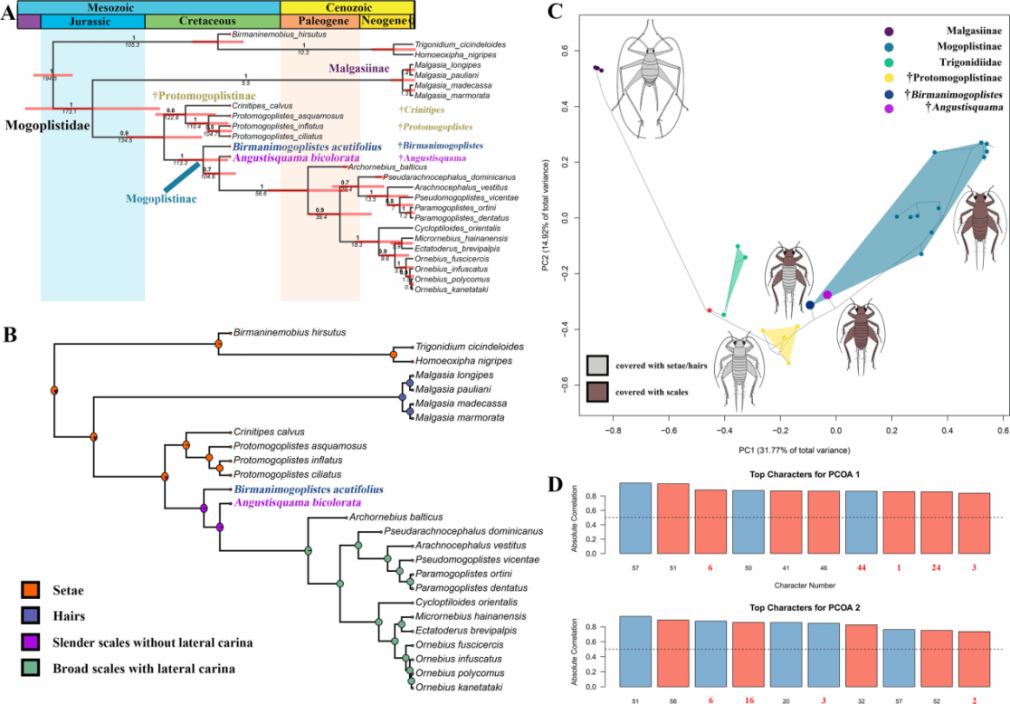 (A)癞蟋科的时间校准系统发育树。(B)体表覆盖物性状的祖先状态重建。(C)离散性状的系统发育形态空间图。(D)关键特征投影(Yuan et al. 2026)。
