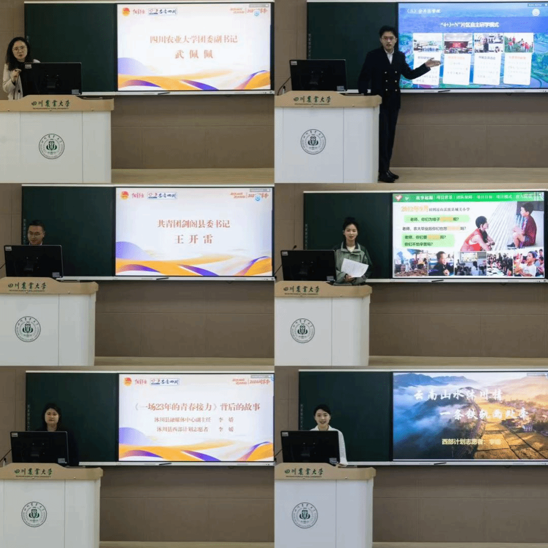 分享环节中,与会嘉宾围绕“如何讲好西部计划故事”展开交流。我校团委副书记武佩佩从高校视角分享了志愿者招募、培养及宣传经验,强调以真实故事感召青年。共青团富顺县委书记崔齐齐重点分享了创新施行的积分制管理模式让服务更有方向、成长更有动力。共青团剑阁县委书记王开雷讲述了通过宣传典型事迹让更多人看见基层奋斗者的做法。温江区西部计划志愿者王余、富顺县西部计划志愿者团总支书记胡红宇分享了从“被服务者”到“服务者”的成长感悟,并借助新媒体平台、校园宣讲等方式,将西部计划的真实面貌传递给同龄人。大学生记者代表、成都理工大学学生吴映嬉表示,青年记者要用镜头和笔触记录真实、温暖、有力量的青春故事,让西部计划的声音传得更远、更广。作为“小切口、大情怀”的典型案例,沐川县融媒体中心副主任李娇与西部计划志愿者李媛共同呈现了《一场23年的青春接力》背后“此心安处是吾乡”的深情,她们以融媒体的笔触将一代代志愿者的坚守生动地展现在公众面前。我校研究生支教团“支启未来”理论宣讲团长期扎根支教一线,把课堂教学、乡村走访、陪伴成长转化为一场场生动的青春分享,以“服务+传播”的方式,让西部计划的精神在讲述中生根、在行动中延续。
