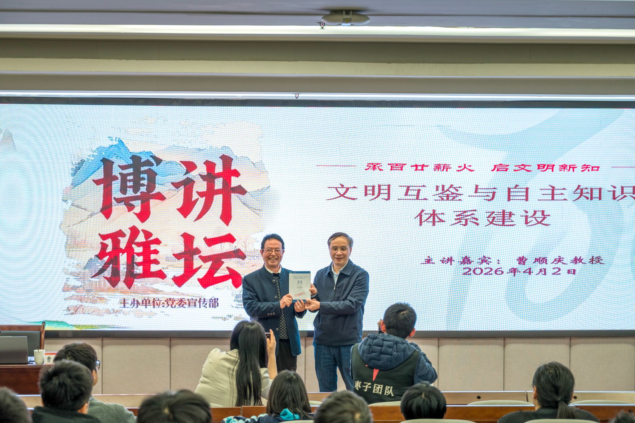 讲座开始前,蒋远胜教授代表宣传部接受了曹顺庆教授赠送的学术集刊《中外文化与文论》。