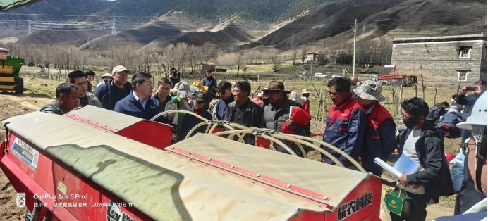 据了解,丘陵山地黏重土壤气力式小粒径种子精量联合播种机系2025年四川省农机研发制造推广应用一体化试点项目之一。该项目由我校与四川耀农农业装备有限公司等单位联合揭榜攻关,以油菜气送式精量联合播种机为熟化基础机型,此前已在油菜、小麦等多种作物上完成多轮田间试验验证。本次青稞播种田间示范,是该机型在高原特色粮食作物上的首次应用拓展,将有力加速高原青稞机械化播种技术的示范推广进程,对建设更高水平“天府粮仓”、推动民族地区农业现代化具有积极促进作用。