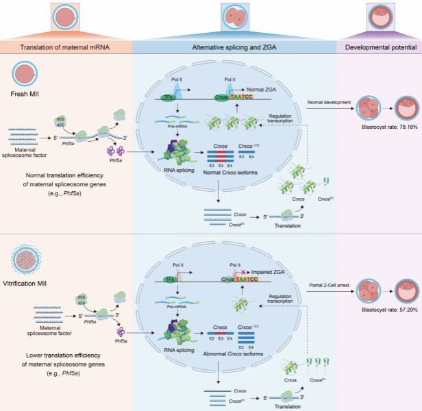 研究发现,玻璃化冷冻可显著抑制母源剪接体基因(如 Phf5a)的翻译,该缺陷传递至早期胚胎,导致2细胞期出现广泛RNA可变剪接异常,关键ZGA调控因子Crxos的全长转录本Egam1第3号外显子跳跃显著增加。Crxos全长变体缺失会损害RNA聚合酶II在ZGA基因上的招募与延伸能力,降低整体转录活性,阻碍胚胎发育。该研究首次揭示“母源剪接体基因翻译抑制—胚胎转录因子剪接异常—ZGA 受损” 的跨代际调控网络与冷冻损伤的关联,突破传统研究聚焦细胞骨架、线粒体等亚细胞结构的局限。靶向恢复剪接体功能或纠正Crxos异常剪接,有望改善冷冻卵母细胞发育潜能,为优化卵母细胞冷冻方案提供理论靶点,对辅助生殖及家畜遗传资源保存具有重要应用价值。