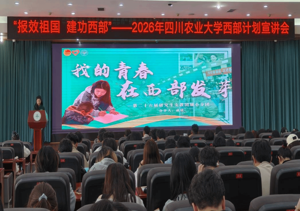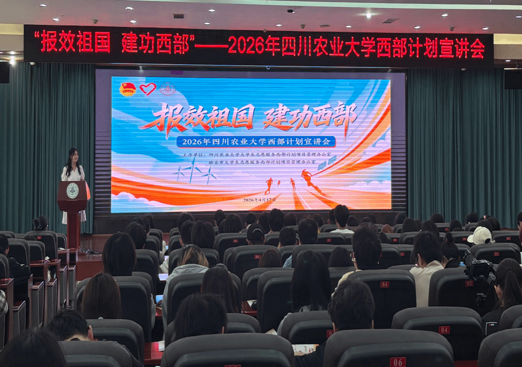 4月17日,“报效祖国 建功西部”——2026年四川农业大学西部计划宣讲会在雅安校区十教一楼报告厅举行。活动同步直播,线上线下共吸引3000余名学子参与。