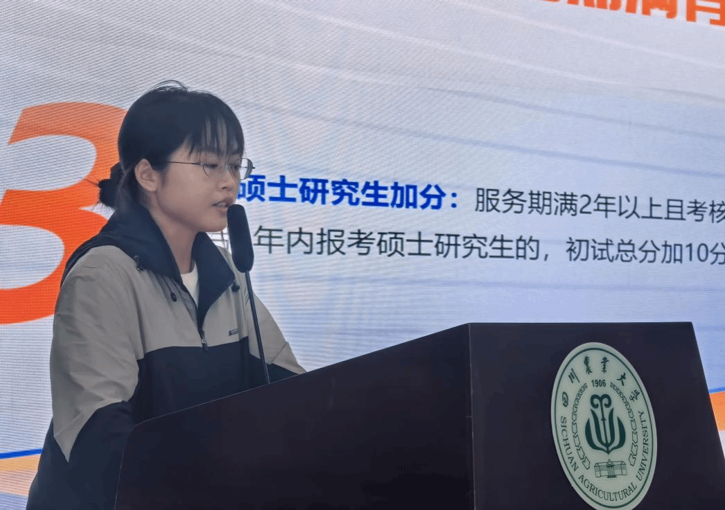 宣讲会上,雅安市大学生志愿服务西部计划项目管理办公室专员王昱心围绕招募条件、服务内容、政策保障及招募流程等核心内容进行了系统解读。针对项目类别差异、服务期限设置、未来职业发展等热点问题,她逐一耐心解答,并热忱邀请更多川农学子投身西部建设,让青春梦想与国家战略同频共振。