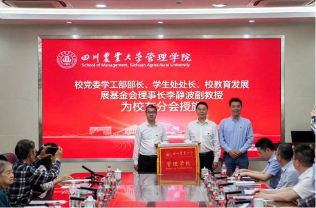 会上,李静波宣读《关于同意四川农业大学管理学院校友分会筹备成立的函》及第一届理事会人员名单。在全场热烈的掌声中,李静波为管理学院校友分会授旗并为校友理事会成员颁发聘书。