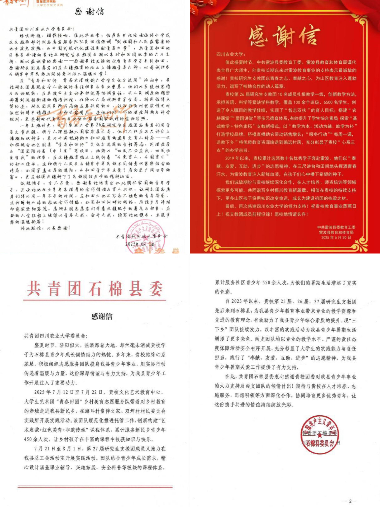 自2024年7月,29名川农学子分赴新疆和田、墨玉,四川雷波、石棉四地六校进行为期一年的支教活动。未来,研支团将继续以立德树人为根本任务,以助力西部发展与乡村振兴为使命,弘扬“奉献、友爱、互助、进步”志愿精神,以实际行动践行“川农大精神”,将个人理想融入国家发展大局,在祖国和人民最需要的地方发光发热,持续为西部民族地区教育进步和经济社会发展贡献川农青春力量。
