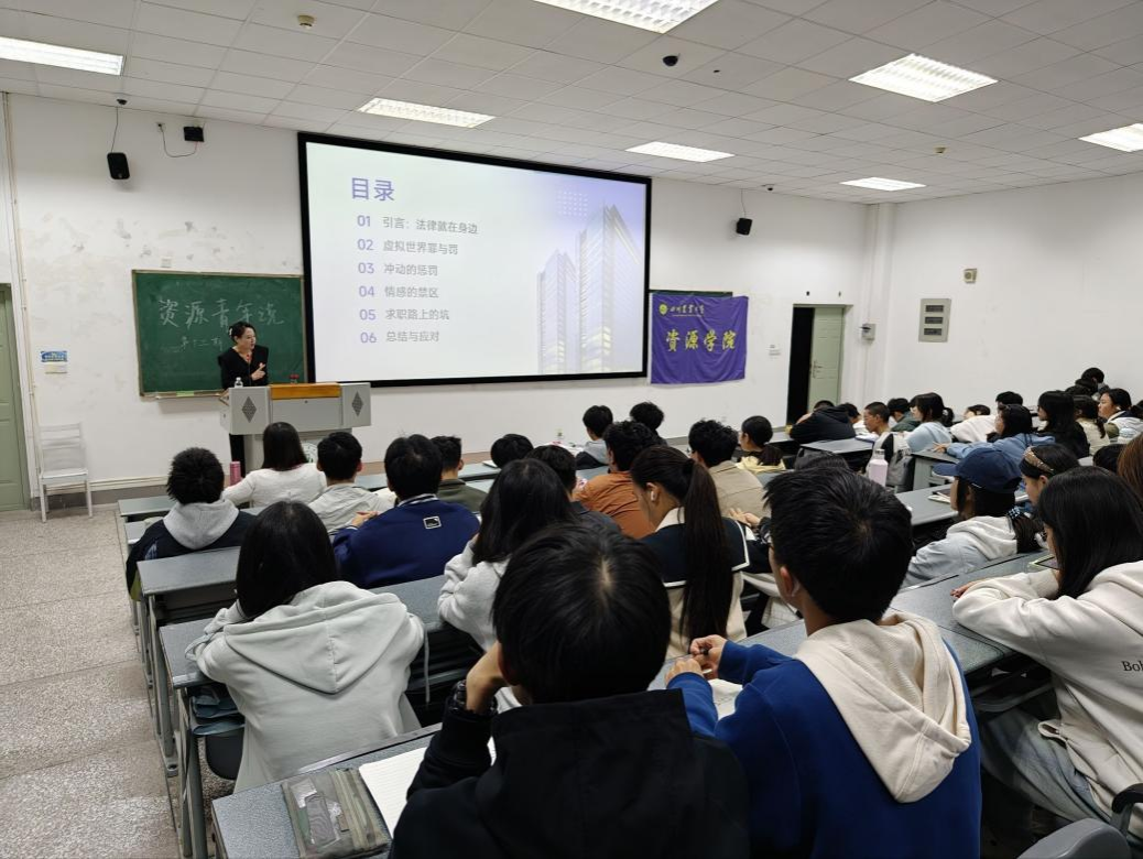 为进一步增强大学生的法律意识和法治观念,有效预防和减少大学生违法犯罪行为发生,强化大学生尊法学法守法用法的良好习惯,营造安全、和谐、文明的校园环境,资源学院于10月24日针对2025级全体新生开展大学生犯罪预防法制专题讲座。本次讲座邀请学校校友、四川致高律师事务所劳动和社会保障专业委员会副主任张琳律师作为主讲嘉宾。