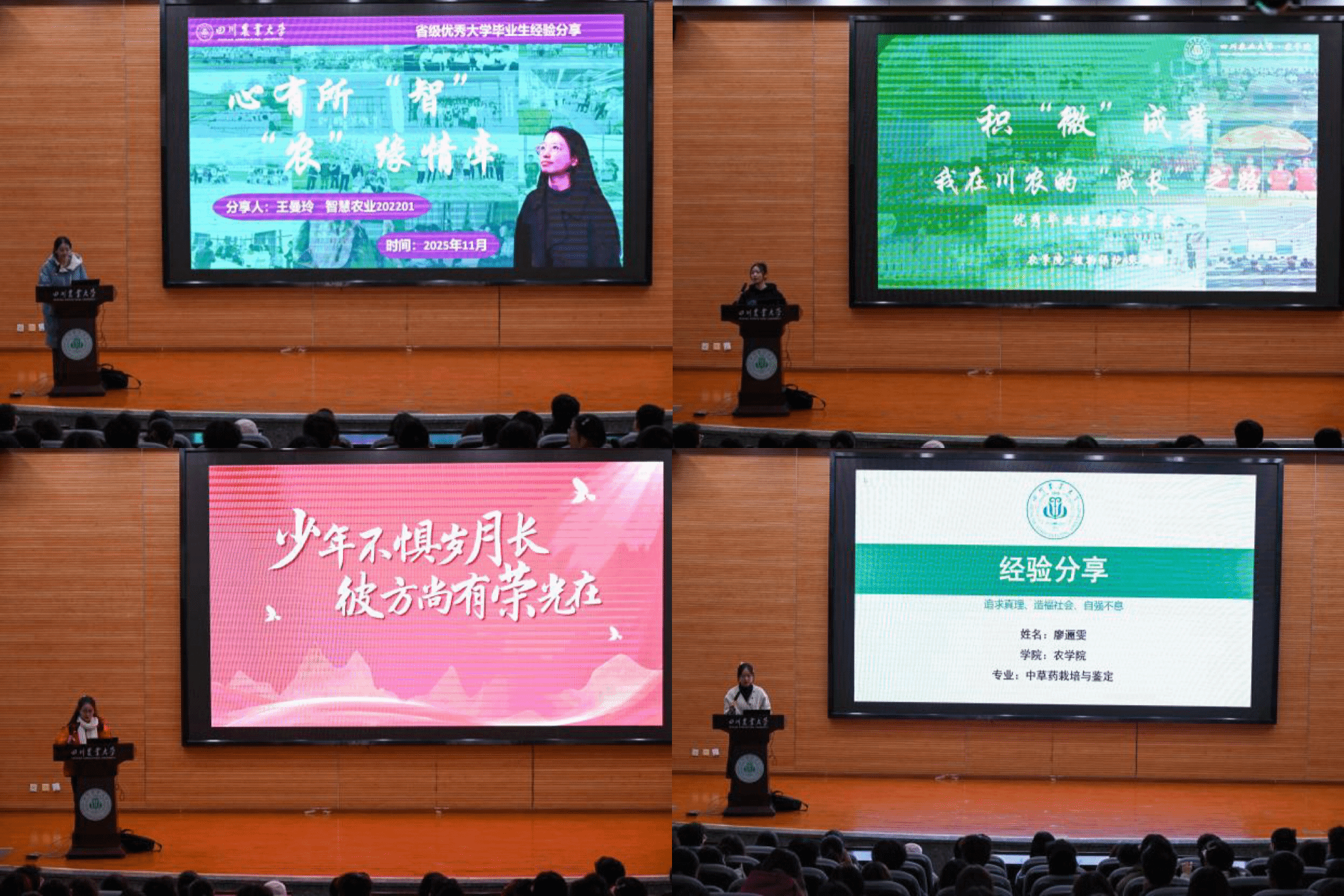 11月18日,由农学院团委主办,以“榜样领航,智启新程”为主题的优秀毕业生经验分享会在二教报告厅举行。学院党委办公室、辅导员马保欣,沈丽淘、刘琦等以及300余名学生参加分享会,与六位朋辈“学霸师姐”共同解锁大学生活的“通关秘籍”,为农学院学风建设注入新的活力。