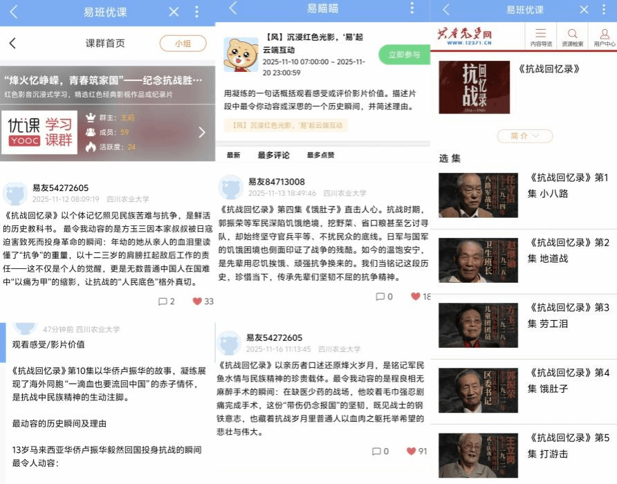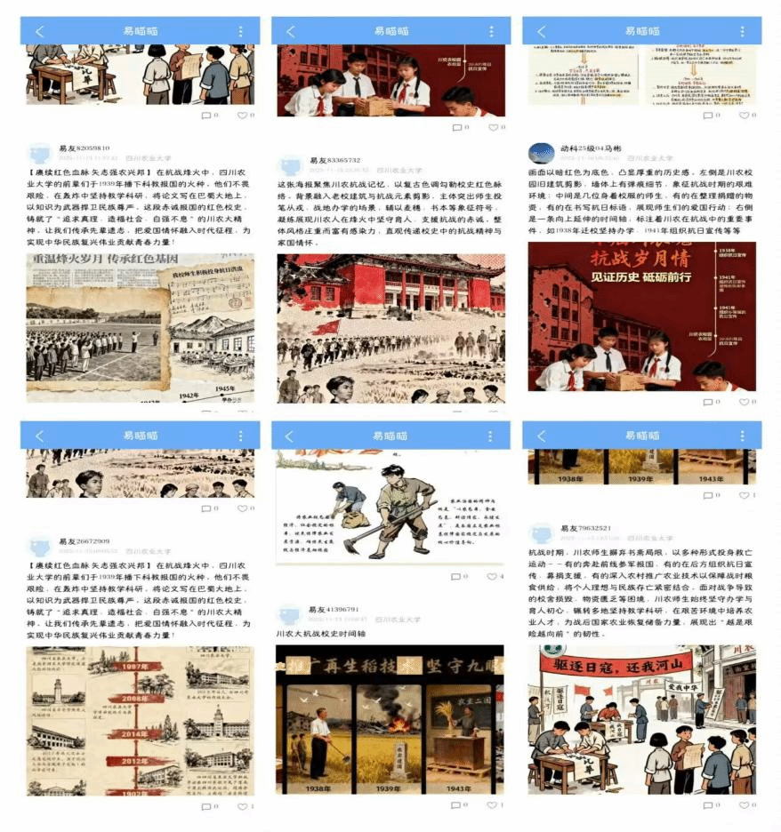 依托易班优课开展的“战史寻光,向光而行”知史明志竞答行活动中,答题内容从抗战历史知识,到“川农大精神”,同学们在答题中重温抗战历史,感悟抗战精神;“校史中的抗战记忆,海报绘红色篇章”创意活动,则引导学生挖掘川农抗战校史故事,以图文海报重塑革命场景,展现青春风采。