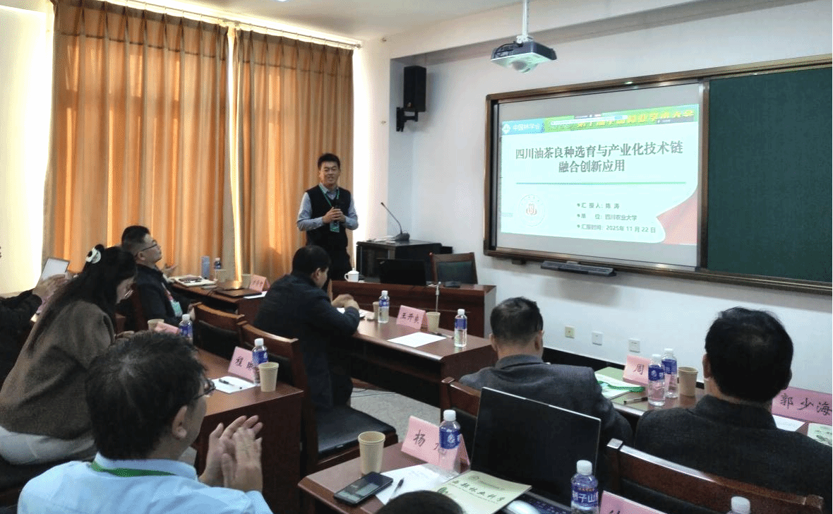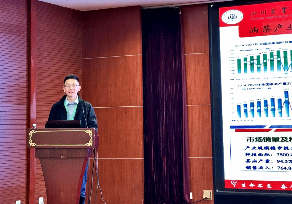 在“油茶产业科学发展”分会场,陈涛以《四川油茶良种选育与产业化技术链融合创新应用》为题作主题报告。报告聚焦四川油茶产业在良种覆盖率、低产林改造等核心痛点,全面介绍了我校团队在良种选育、新品种示范推广、省级良种认定、高效种苗繁育、丰产栽培体系构建、低产林改造、复合种植模式探索及副产物高值化利用等全产业链环节取得的技术突破。在“木本油料”分会场,团队核心成员孔庆博博士作题为《油茶种质资源收集评价及利用》的报告。报告全景式展示了从资源收集评价到良种选育推广的研发全貌,全面介绍了如何打通从基因资源到产业良种的技术路径,为油茶产业的种源瓶颈提供了重要的技术解决方案。