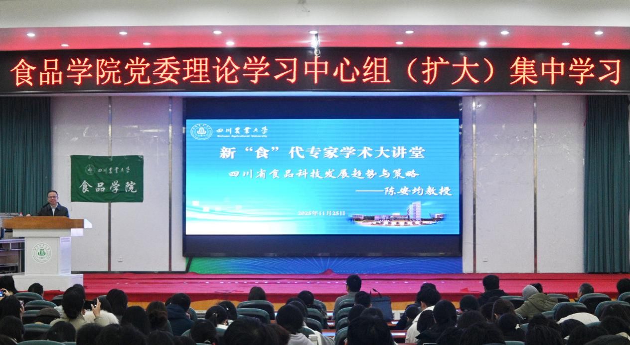 为深入学习贯彻党的二十届四中全会精神,11月25日下午,食品学院党委理论学习中心组(扩大)集中学习在十教二楼小礼堂举行。本次学习邀请到学院陈安均教授作题为《四川食品科技创新发展趋势与策略》的专题报告。学院党委书记何勇、副院长张清,党委理论学习中心组成员、党委委员、纪委委员、教工支部书记、系室主任参会,400余名教职工、师生党员和入党积极分子旁听学习。何勇主持学习会。