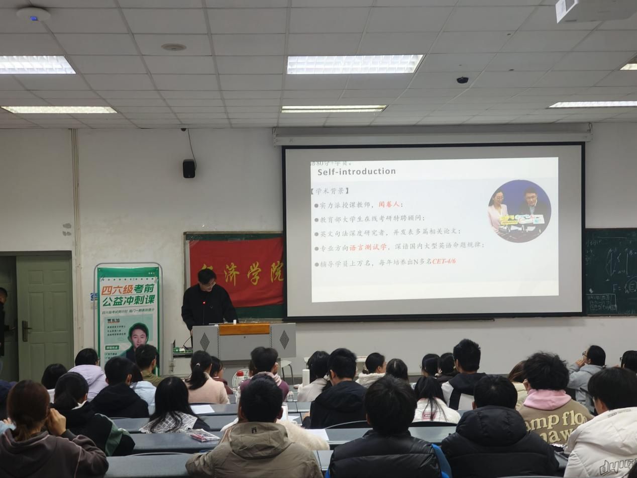 这仅是学院本学期系列精准讲座的缩影,秉持“量需为措”的服务理念,经济学院积极联动校外优质资源,本学期先后开展面向基础夯实与能力拔高的多场专题讲座,累计覆盖1600余人次。讲座紧扣四六级题型改革动态与命题趋势,授课专家不仅系统拆解听力、阅读、写作、翻译各大模块的核心考点与解题策略,更直击学生日常备考中的常见误区与盲点。通过真题的精讲精练,帮助同学们快速构建清晰的复习框架,实现从“埋头苦学”到“巧学善思”的转变。