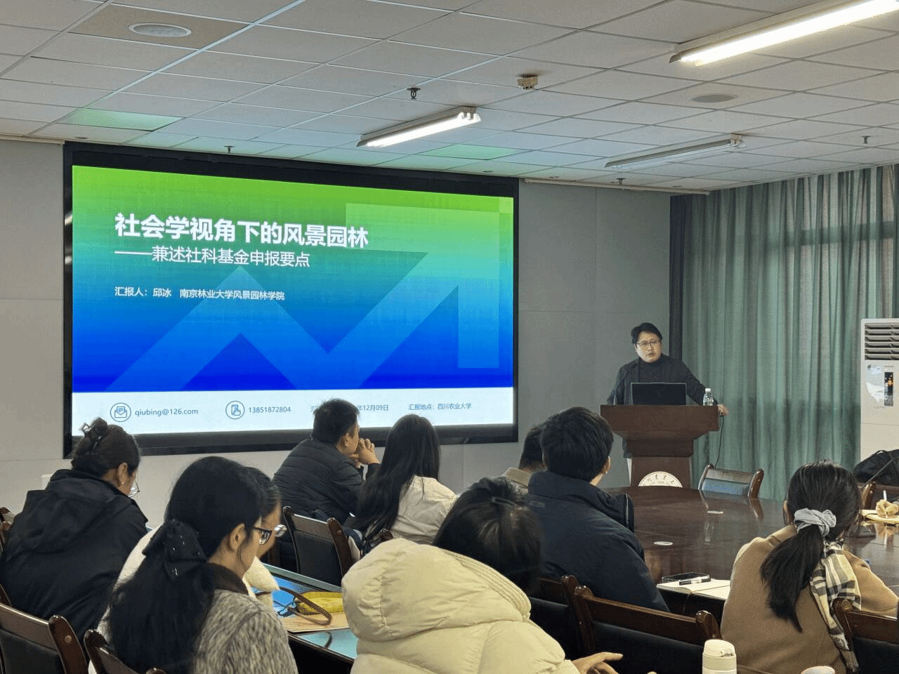 邱冰教授以“社会学视角下的风景园林——兼述社科基金申报要点”为题,带来了一场兼具理论深度与实践价值的专题报告。他立足空间生产、集体记忆等核心理论,结合大运河保护与利用研究等典型案例,系统阐释了风景园林与社会学交叉融合的研究路径,为在场师生拓展研究视野提供了重要启发。