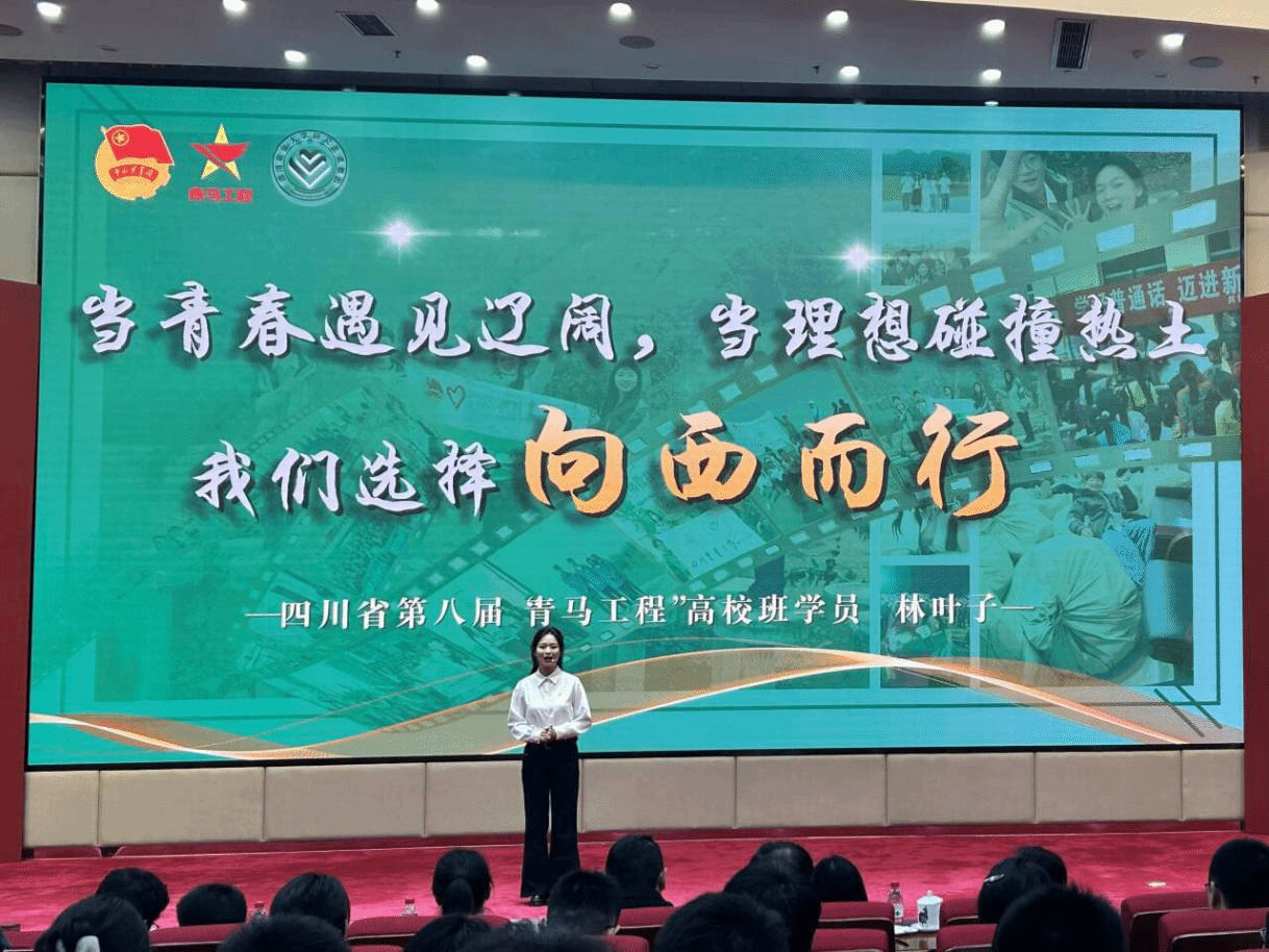 实践成果分享交流环节,我校团委学生兼职副书记、省青马学员、第26届研究生支教团成员林叶子作为代表专题分享。她以“当青春遇见辽阔,当理想碰撞热土,我们选择向西而行”为主题,结合自身在支教地的志愿服务经历,生动讲述了川农青马学员扎根基层教育一线的实践故事。从精心设计课堂教学、助力乡村学生成长,到结合川农专业特色开展直播助农、推动乡村教育与乡村振兴协同发展,林叶子用真实的案例、真挚的情感,展现了川农青马学员“把论文写在祖国大地上”的责任担当。