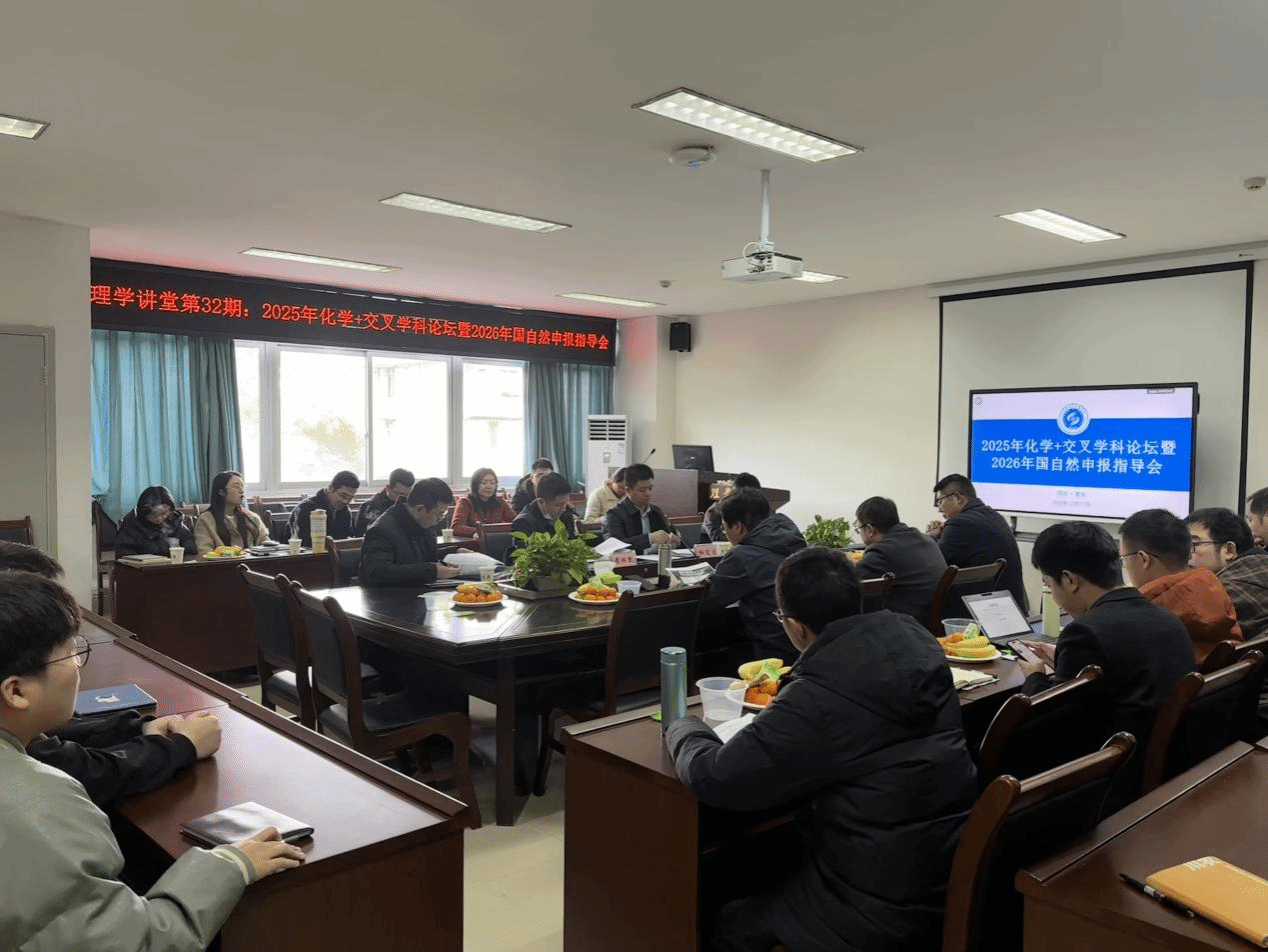 12月17日,理学院理学讲堂第32期举行了“‘化学+’交叉学科论坛暨2026年国自然申报指导会”。会议特邀科技管理处副处长杜俊波教授、草业科技学院院长黄琳凯教授、动物营养研究所冯斌教授、生命科学学院吴琦教授到会指导。理学院领导班子、部分青年教师及研究生参会。会议由院长吴贺君,副院长、副书记、纪委书记鲁志伟主持。