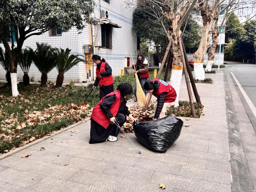 晨光熹微,略带寒意的春风挡不住大家的劳动热情。活动现场,志愿者们在后勤老师的指导下,手持扫帚、垃圾钳、钢丝耙等工具,迅速投入清扫工作。大家默契配合,有的负责清扫梧桐树下积存的落叶,有的细心捡拾草丛中隐匿的零星垃圾,有的负责装袋清运。经过近两小时的辛勤劳动,草坪上厚厚的落叶层被清理干净,蛰伏的春草在阳光下显露生机,校园面貌焕然一新。