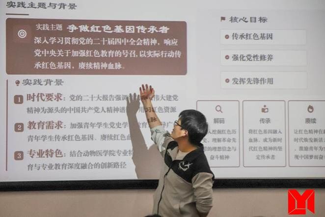 9支实践团队依次登台,以“汇报+互动”的形式,分享在乡村振兴、支教服务、非遗传承、专业探索及科普调研等领域的实践故事与成长感悟。“医心向党·护宠兴乡”团队以“红色赋能+科普调研”模式深入基层,形成了高质量调研报告;“青衿守遗·艺启童蒙”团队创新打造“非遗+普法”实践模式,将文化传承与法治宣传有机结合;由大一新生组成的“猪猪我来了”队则通过跨城走访,开展了多场景专业认知实践,并寻找猪场里的“她”力量……各团队均体现出将专业知识与社会需求紧密结合的鲜明特色,展现了动医学子扎根现实、服务社会的责任担当。