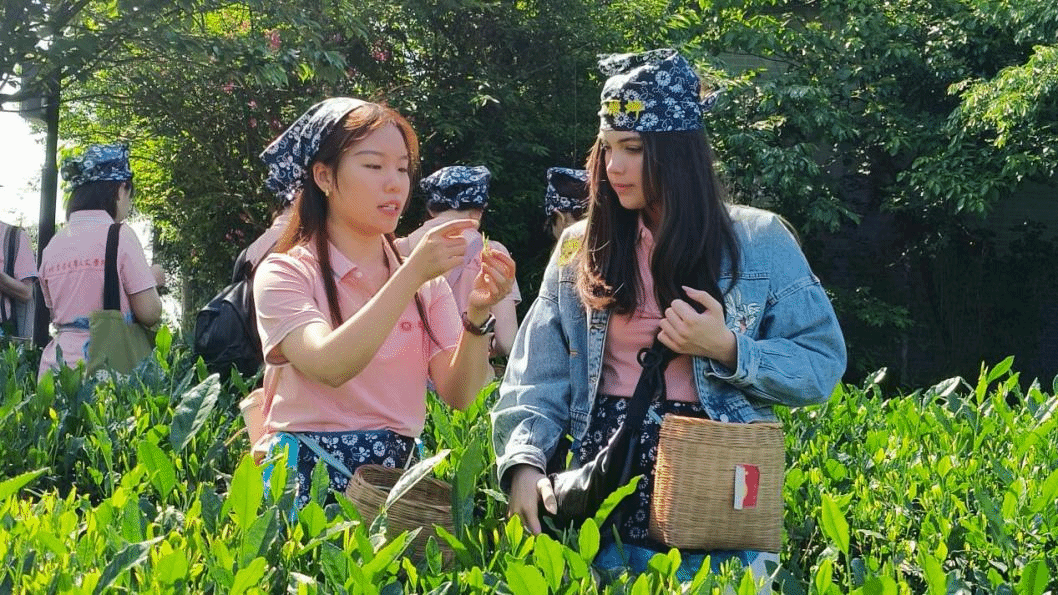 在当地茶农的悉心指导下,中外学生混合编组,认真学习“一芽一叶”的标准手法。许多同学都是初次体验采茶,茶园间不时传来中外学子兴致盎然的交流与探讨声,氛围热烈而融洽。