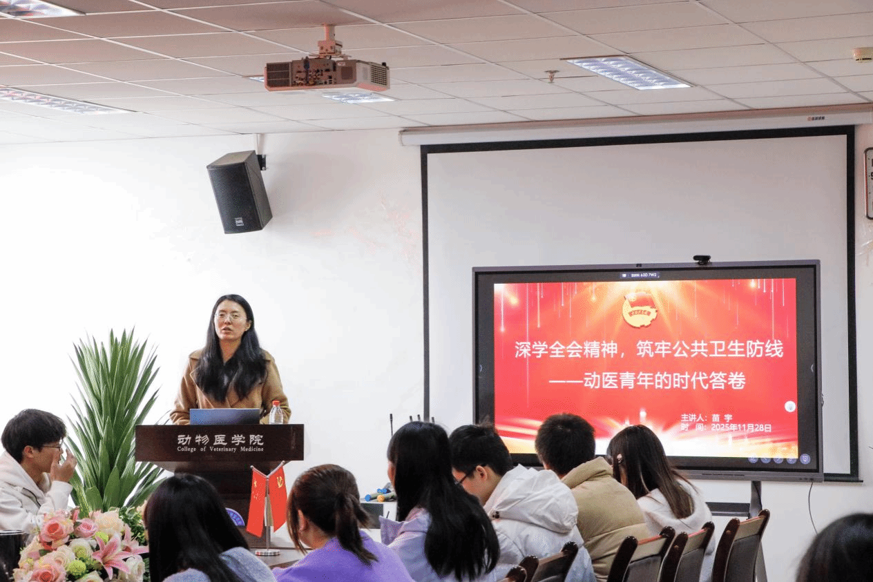 日前,动物医学院学院党委办公室主任兼团委书记苗宇以“深学全会精神,筑牢公共卫生防线——动医青年的时代答卷”为题,为全体入团积极分子讲授了一堂主题思政课,引导青年在理论学习中坚定信念,在实践锻炼中锤炼本领。