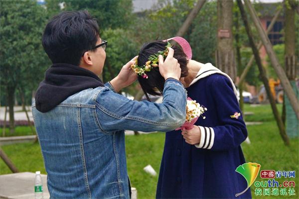 “新郎”郑重地为“新娘”戴上清新的花环,让来宾见证了他们单纯的爱情。中国青年网通讯员 张婧 摄