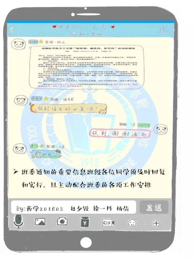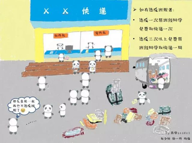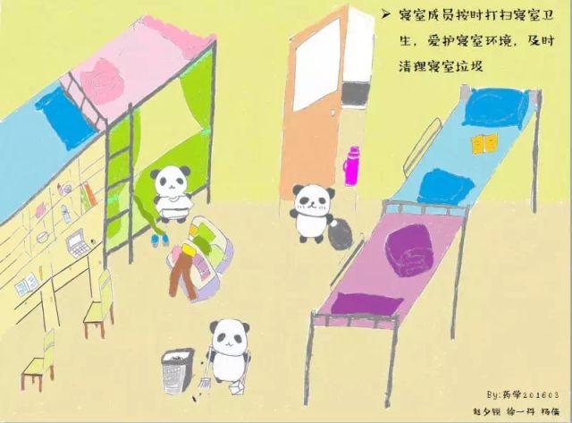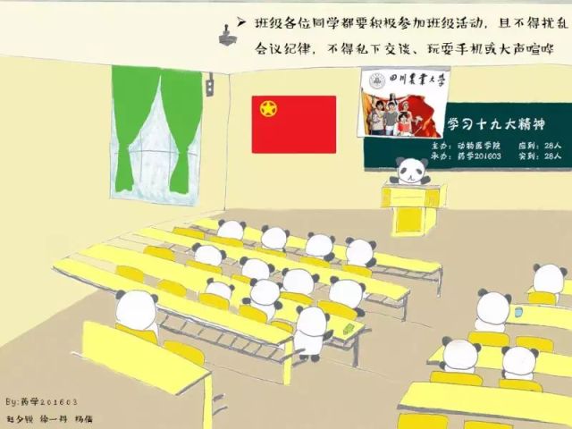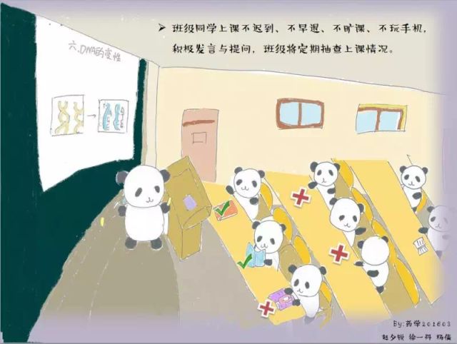 动物医学院药学1603班的同学,选择憨态可掬的大熊猫为代表,手绘了一组熊猫班规图。绘画场景有寝室、教室、实验室等校园环境,制作者通过大熊猫的肢体语言传达班规内容。比如,课堂上有一只手绘熊猫老师拿着粉笔讲课,听讲的小熊猫则被禁止交头接耳,阅读课外读物,玩手机等行为。