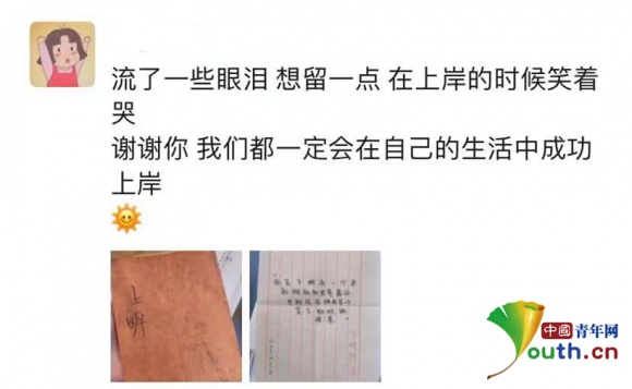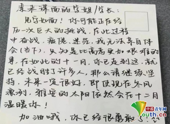 “有心啦,太感动了”“谢谢,我们都一定会成功上岸”,收到祝福的考研学子纷纷在朋友圈表达感谢。在问及收到手写祝福的感受时,该校理学院化学生物学专业学生路西子说,它就像辛苦复习路上温暖的光,给了他们足够的力量。“在考研路上,我们会继续背负着梦想,攻克难关,不断前行。”