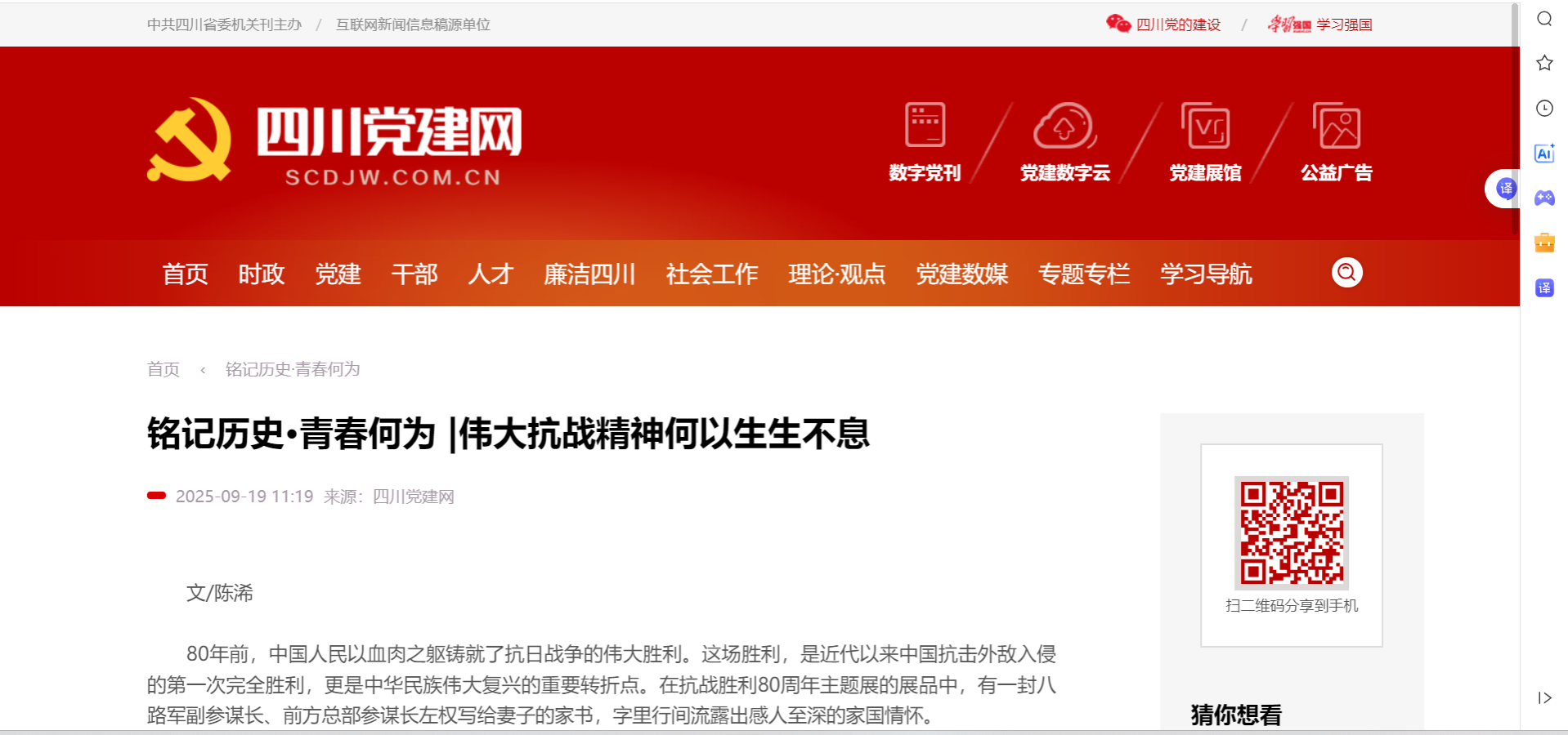 80年前,中国人民以血肉之躯铸就了抗日战争的伟大胜利。这场胜利,是近代以来中国抗击外敌入侵的第一次完全胜利,更是中华民族伟大复兴的重要转折点。在抗战胜利80周年主题展的展品中,有一封八路军副参谋长、前方总部参谋长左权写给妻子的家书,字里行间流露出感人至深的家国情怀。