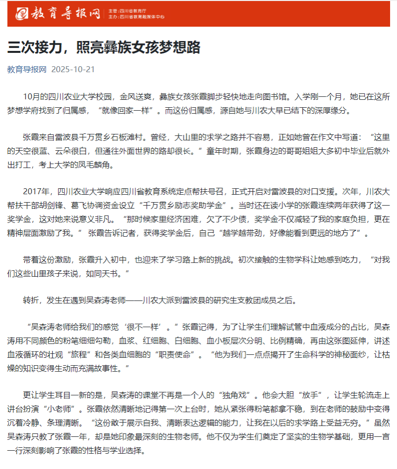 2017年,四川农业大学响应四川省教育系统定点帮扶号召,正式开启对雷波县的对口支援。次年,川农大帮扶干部胡剑锋、葛飞协调资金设立“千万贯乡励志奖助学金”。当时还在读小学的张霞连续两年获得了这一奖学金,这对她来说意义非凡。“那时候家里经济困难,欠了不少债,奖学金不仅减轻了我的家庭负担,更在精神层面激励了我。” 张霞告诉记者,获得奖学金后,自己“越学越带劲,好像能看到更远的地方了”。