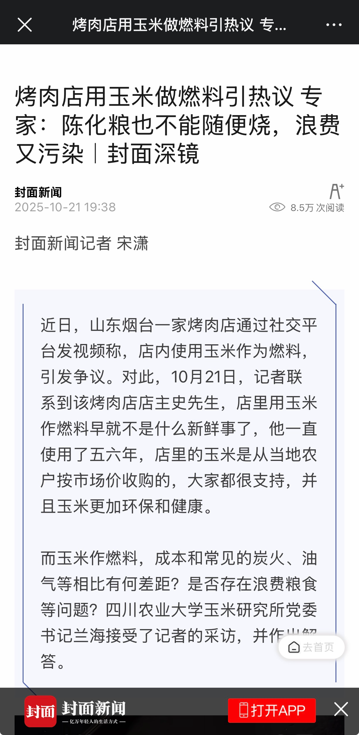 他进一步指出,当前许多城市出于环保考虑,已限制露天明火烧烤和传统炭烤,推广电烤或气烤设备。“如果真要讲环保,天然气才是更清洁、高效的替代方案。相比之下,烧玉米既没有排放优势,也没有成本优势,纯粹是一种噱头。”