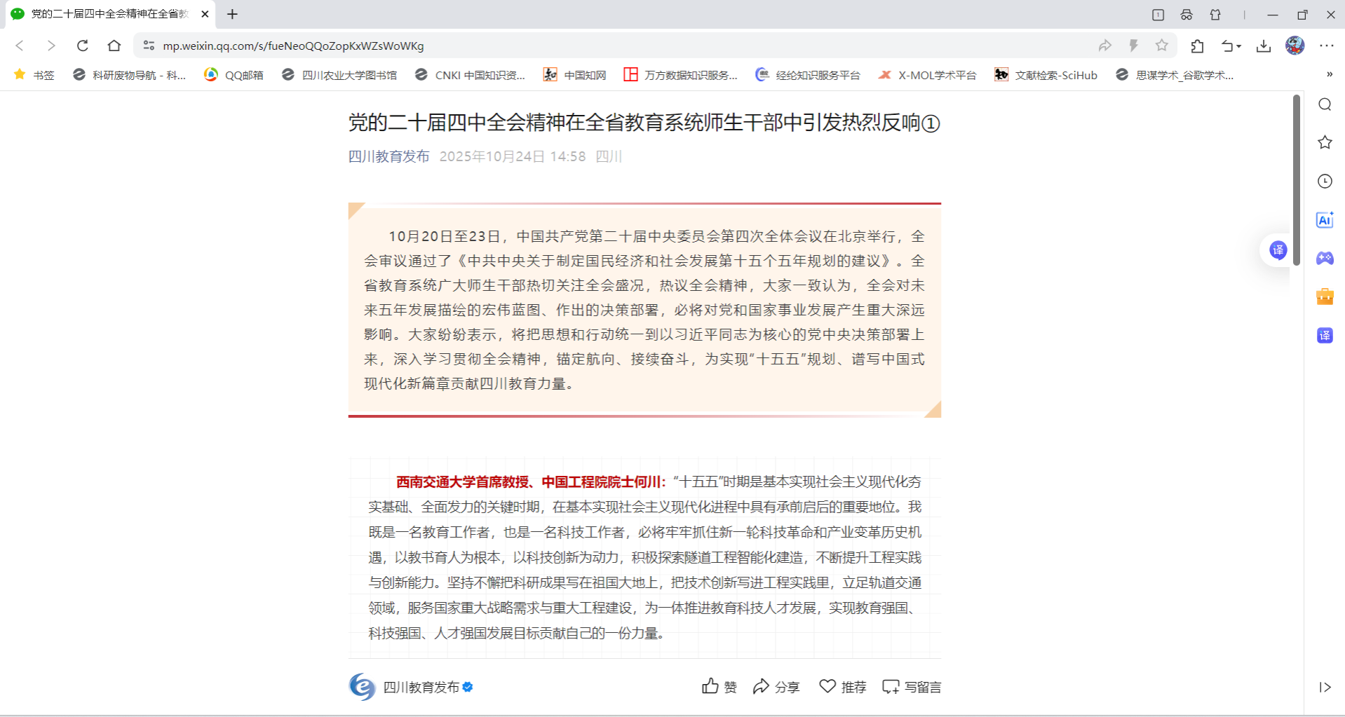 10月20日至23日,中国共产党第二十届中央委员会第四次全体会议在北京举行,全会审议通过了《中共中央关于制定国民经济和社会发展第十五个五年规划的建议》。全省教育系统广大师生干部热切关注全会盛况,热议全会精神,大家一致认为,全会对未来五年发展描绘的宏伟蓝图、作出的决策部署,必将对党和国家事业发展产生重大深远影响。大家纷纷表示,将把思想和行动统一到以习近平同志为核心的党中央决策部署上来,深入学习贯彻全会精神,锚定航向、接续奋斗,为实现“十五五”规划、谱写中国式现代化新篇章贡献四川教育力量。