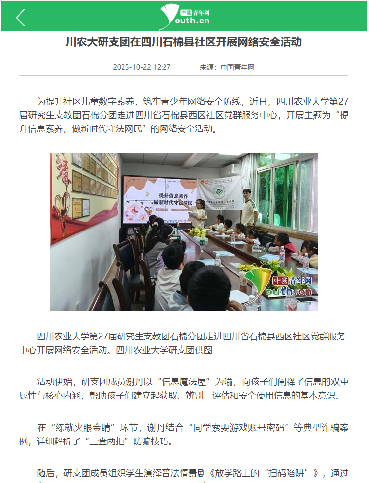 为提升社区儿童数字素养,筑牢青少年网络安全防线,近日,四川农业大学第27届研究生支教团石棉分团走进四川省石棉县西区社区党群服务中心,开展主题为“提升信息素养,做新时代守法网民”的网络安全活动。