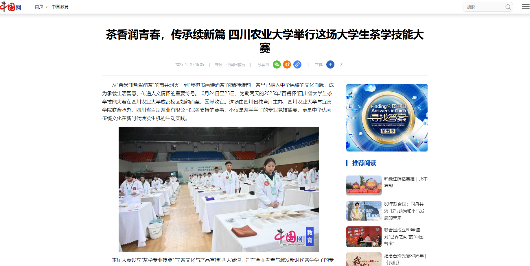 从“柴米油盐酱醋茶”的市井烟火,到“琴棋书画诗酒茶”的精神雅韵,茶早已融入中华民族的文化血脉,成为承载生活智慧、传递人文情怀的重要符号。10月24日至25日,为期两天的2025年“百岳杯”四川省大学生茶学技能大赛在四川农业大学成都校区如约而至、圆满收官。这场由四川省教育厅主办,四川农业大学与宜宾学院联合承办,四川省百岳茶业有限公司冠名支持的赛事,不仅是茶学学子的专业竞技盛宴,更是中华优秀传统文化在新时代焕发生机的生动实践。