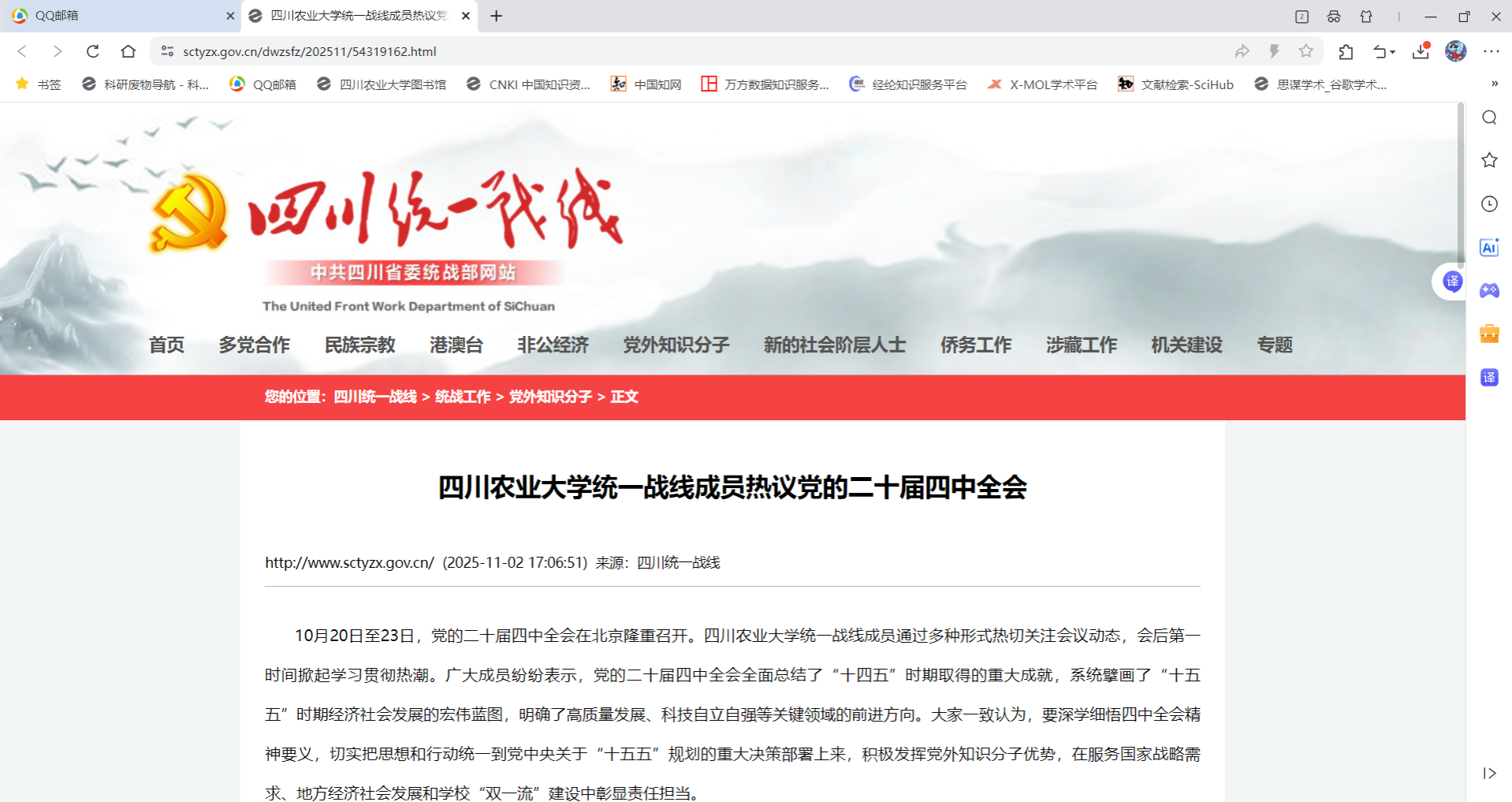 10月20日至23日,党的二十届四中全会在北京隆重召开。四川农业大学统一战线成员通过多种形式热切关注会议动态,会后第一时间掀起学习贯彻热潮。广大成员纷纷表示,党的二十届四中全会全面总结了“十四五”时期取得的重大成就,系统擘画了“十五五”时期经济社会发展的宏伟蓝图,明确了高质量发展、科技自立自强等关键领域的前进方向。大家一致认为,要深学细悟四中全会精神要义,切实把思想和行动统一到党中央关于“十五五”规划的重大决策部署上来,积极发挥党外知识分子优势,在服务国家战略需求、地方经济社会发展和学校“双一流”建设中彰显责任担当。