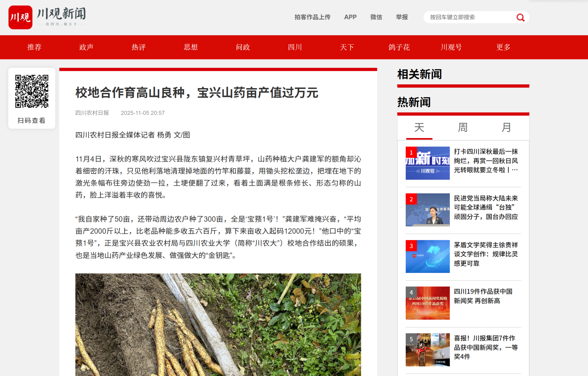 “我自家种了50亩,还带动周边农户种了300亩,全是‘宝蓣1号’!”龚建军难掩兴奋,“平均亩产2000斤以上,比老品种能多收五六百斤,算下来亩收入起码12000元!”他口中的“宝蓣1号”,正是宝兴县农业农村局与四川农业大学(简称“川农大”)校地合作结出的硕果,也是当地山药产业绿色发展、做强做大的“金钥匙”。