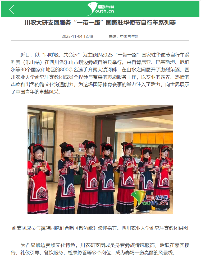 近日,以“同呼吸、共命运”为主题的2025“一带一路”国家驻华使节自行车系列赛(乐山站)在四川省乐山市峨边彝族自治县举行。来自肯尼亚、巴基斯坦、尼泊尔等30个国家和地区的800余名选手齐聚大渡河畔,在山水之间展开了激烈角逐。四川农业大学研究生支教团成员全程参与赛事的志愿服务工作,以专业的素养、热情的态度和出色的跨文化沟通能力,为这场国际体育赛事的举办注入了活力,向世界展示了中国青年的卓越风采。