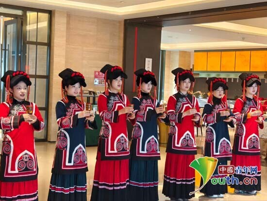 在嘉宾接待环节,研支团成员杨倩、向雪在嘉宾抵达时,与其他彝族同胞一同唱响《敬酒歌》,以独具民族特色的方式表达了对国际友人的热烈欢迎。开幕式现场,研支团成员游今、龙婉婷、徐茂等以规范的动作引导嘉宾入场,展现出良好的精神面貌与专业仪态。开幕式后,多名成员还承担了颁奖礼仪的服务工作。
