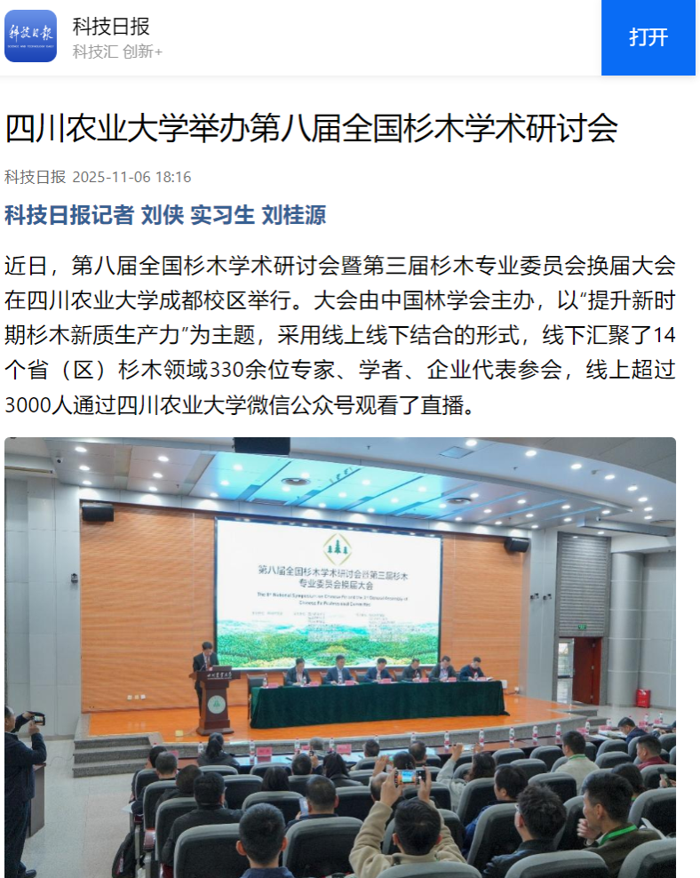 近日,第八届全国杉木学术研讨会暨第三届杉木专业委员会换届大会在四川农业大学成都校区举行。大会由中国林学会主办,以“提升新时期杉木新质生产力”为主题,采用线上线下结合的形式,线下汇聚了14个省(区)杉木领域330余位专家、学者、企业代表参会,线上超过3000人通过四川农业大学微信公众号观看了直播。