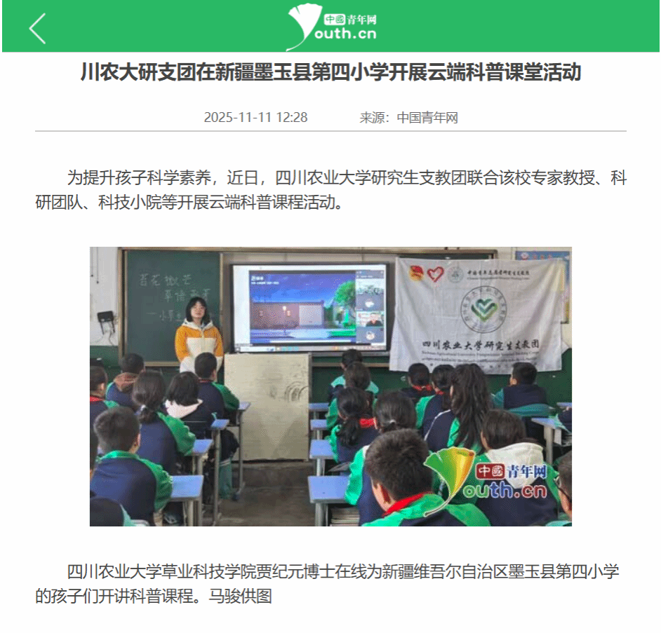 四川农业大学草业科技学院贾纪元博士在线为新疆维吾尔自治区墨玉县第四小学的孩子们开讲科普课程。马骏供图